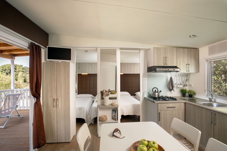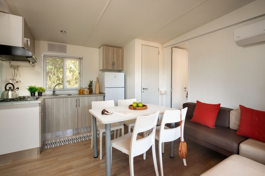 Indkvarteringsmulighederne omfatter moderne og funktionelle mobile hjem, med tilgængelige mobile hjem for personer med handicap, og rummelige pladser omgivet af grønne områder i vores campingområde, ideelle for dem, der søger en ægte kontakt med naturen uden at gå på kompromis med komforten.